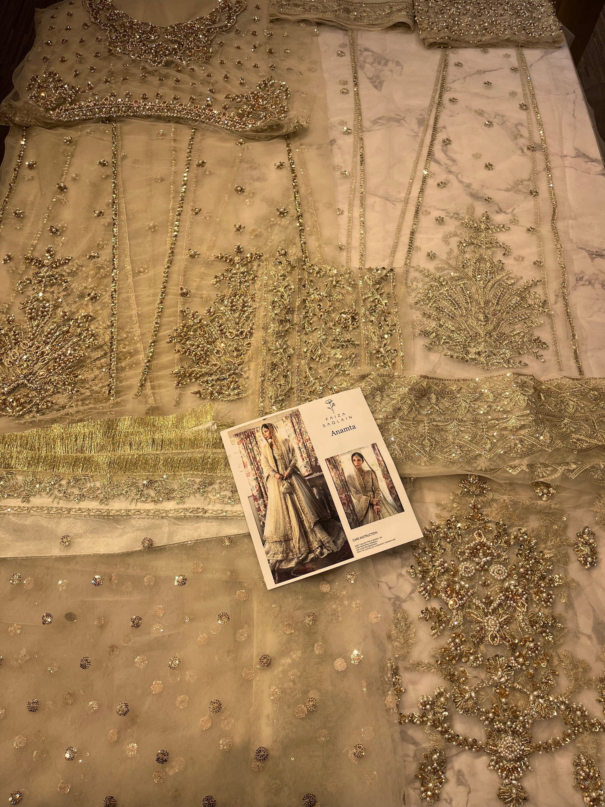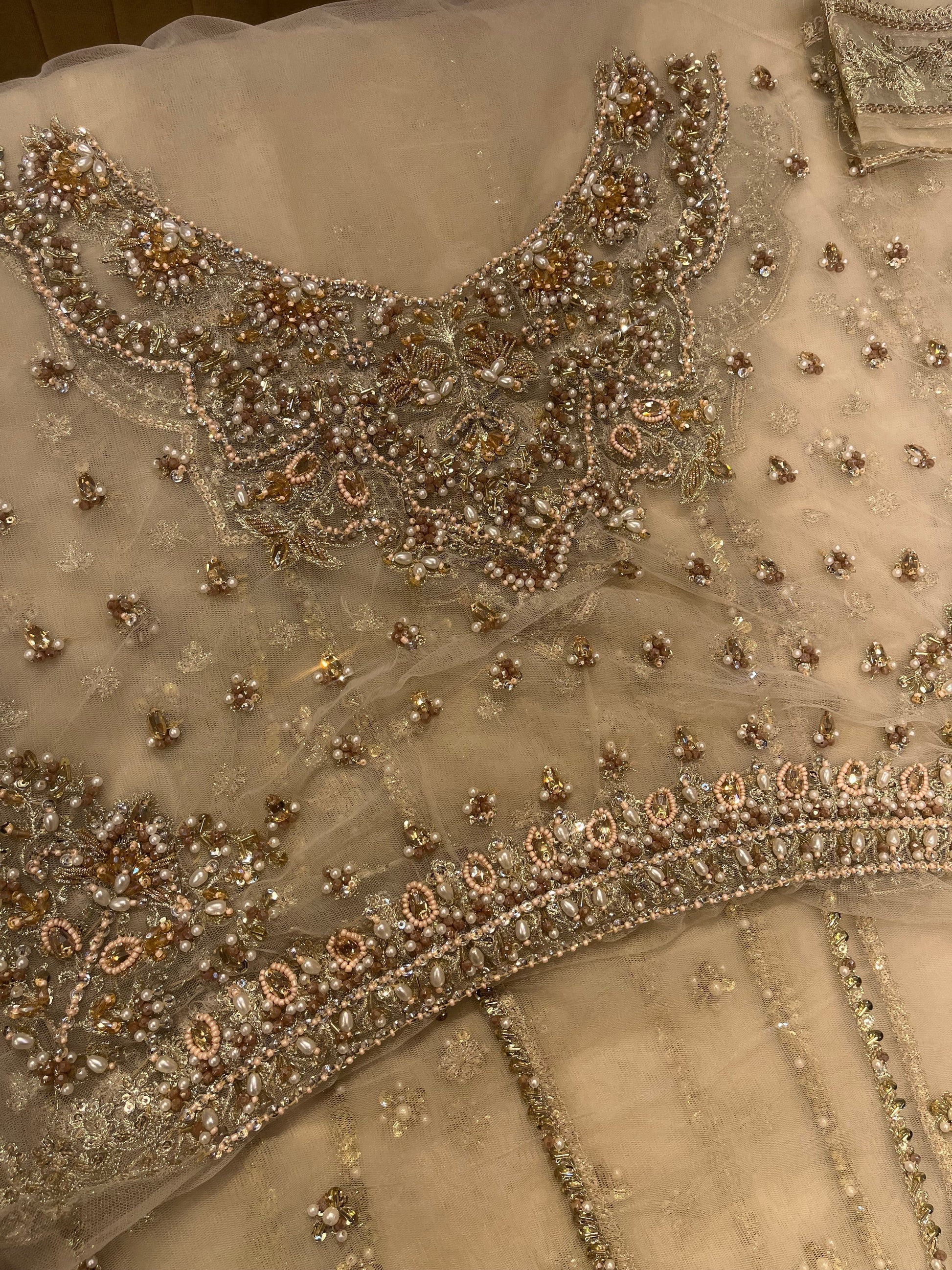 Description: An ivory tulle double layered pishwas, hand worked using dabka, zardozi and hand cut sitara.