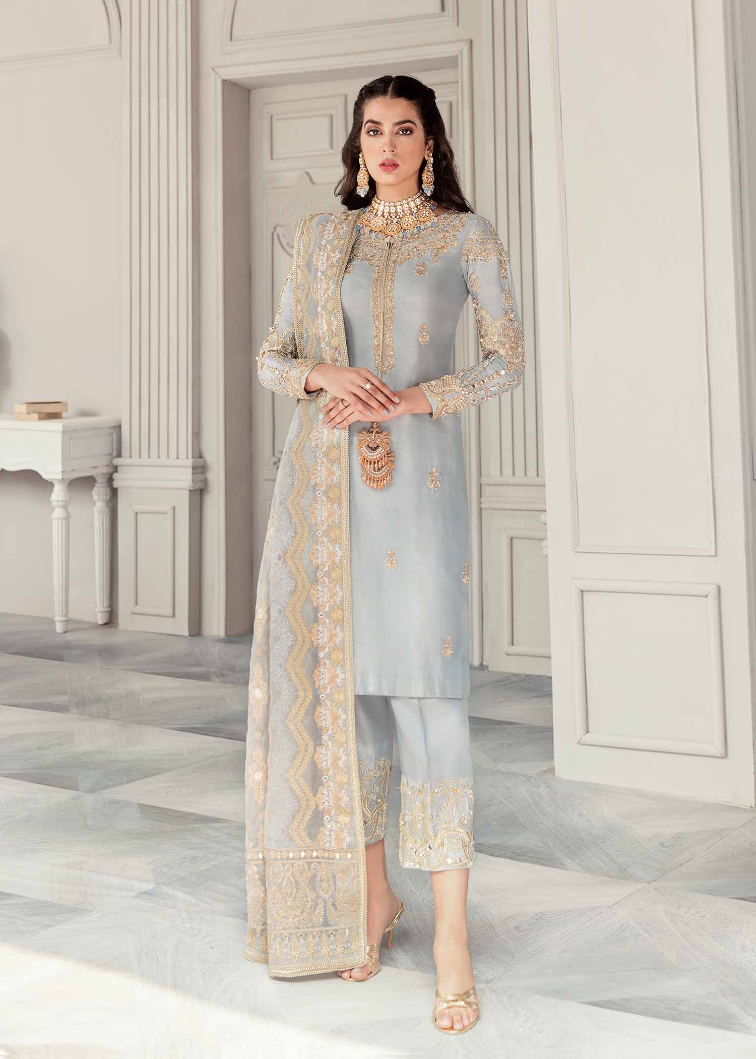 Indulge in the epitome of elegance with Zyra, an exquisite long Korean silk shirt in a rich, luxurious bottle green tone. This opulent piece is a celebration of timeless beauty, featuring intricate embroidered borders and a neckline that enhances its sophisticated design. The meticulous craftsmanship is showcased through fine embellishments that adorn the entire border of the shirt, creating a stunning visual effect. To elevate the ensemble even further, Zyra is paired with a fully embroidered organza dupatta, adding a touch of glamour and completing the look with grace and finesse.