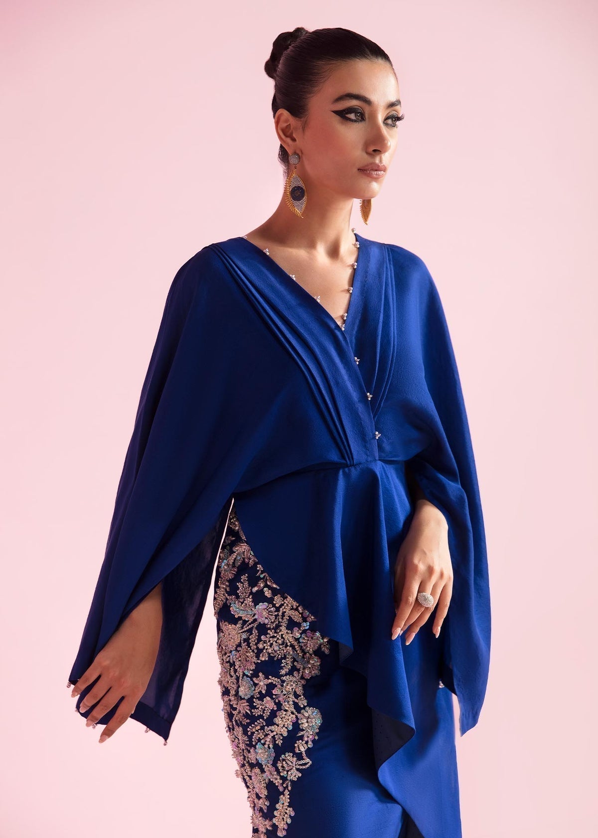 Chloe is navy blue raw silk ruffle peplum dress, a true work of art that is both elegant and striking. The peplum silhouette is both flattering and feminine, creating a playful and sophisticated look. This dress is intricately hand-embellished with a variety of exquisite details, including French sequins, crystals, dabka, and threadwork. The embellishments are carefully placed to create a stunning effect. The combination of the rich navy blue fabric and the sparkling embellishments creates a truly unique and eye-catching look. The ruffle detailing adds a touch of playfulness and movement to the dress, creating a dynamic and visually appealing effect.