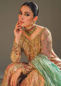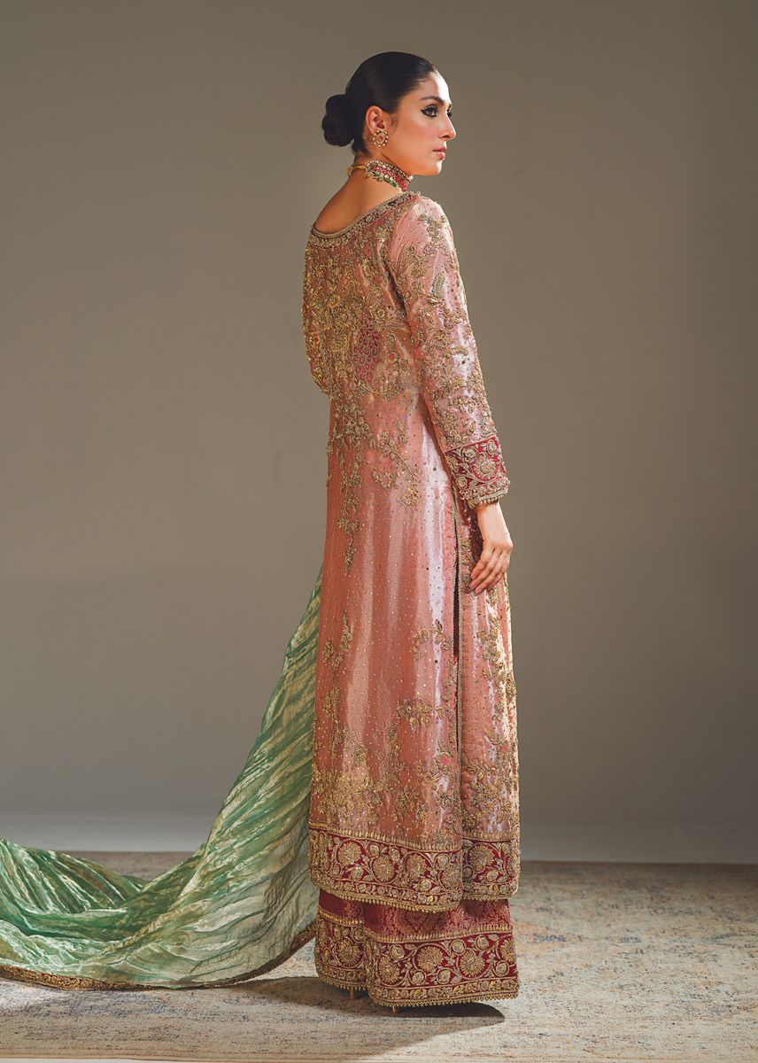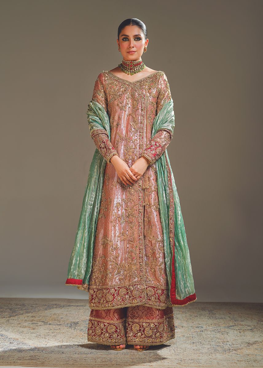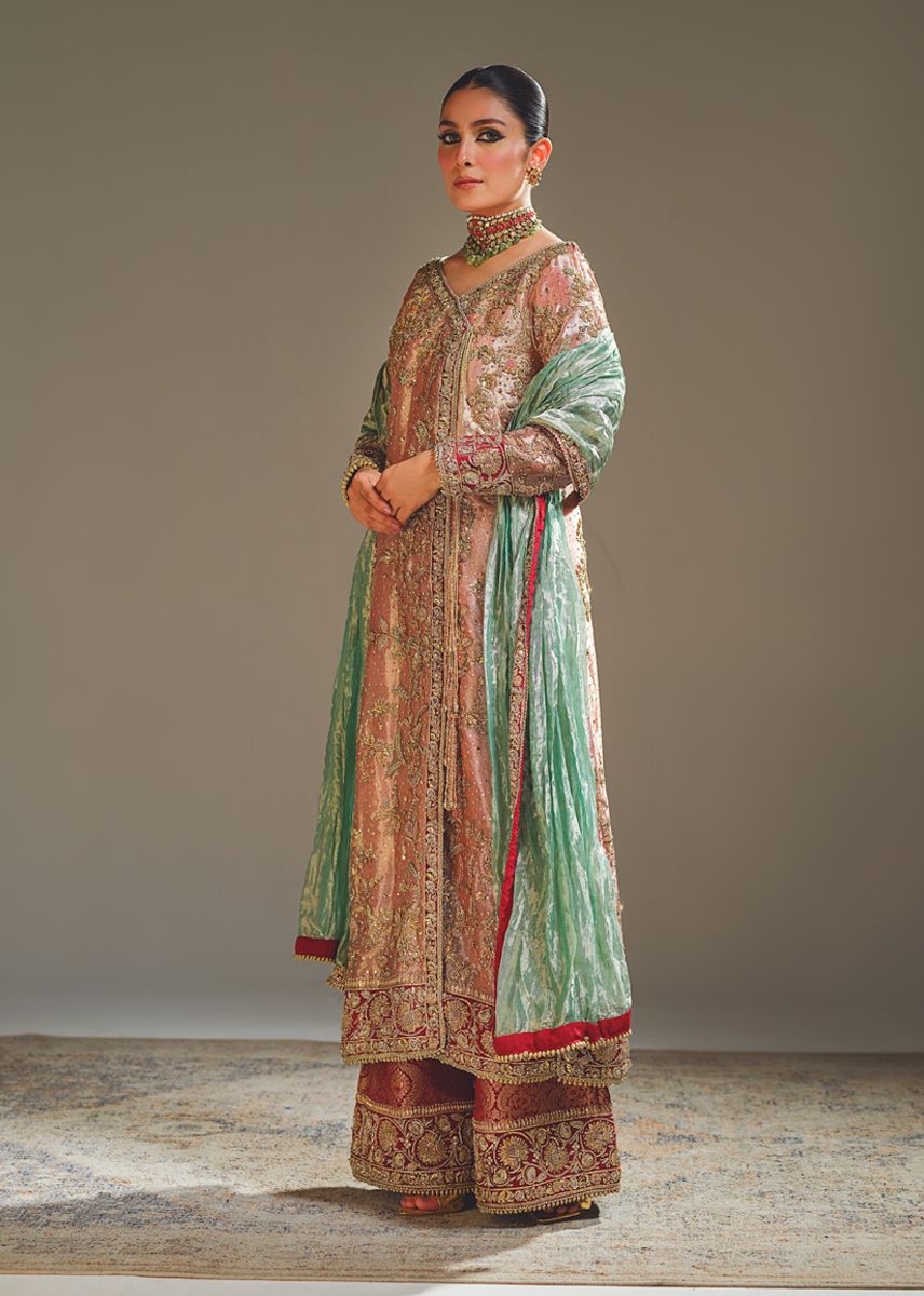Description: The centerpiece of "Classy Charm" is its traditional angrakha cut shirt known for its classic and flattering silhouette, adorned with intricate hand embellishments that sprawl all over in a delicate jal. The jade green color of the dupatta adds a refreshing and regal touch to the outfit.The ensemble is completed with embellished maroon jamawar azar pants, creating a harmonious and balanced color palette. The jamawar fabric adds a luxurious and textured element to the outfit, enhancing its overall feel."Classy Charm" is the epitome of classic style and sophistication, perfect choice for those who appreciate traditional aesthetics with a touch of contemporary elegance.