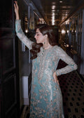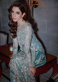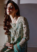 "FEROZEAH" is a elegant long shirt, designed in a serene aqua tone,ornamented with intricate silver embellishments. The hand embellished patterns, featuring floral motifs, are complemented by delicate handwork, creating a refined and luxurious jal across the outfit.