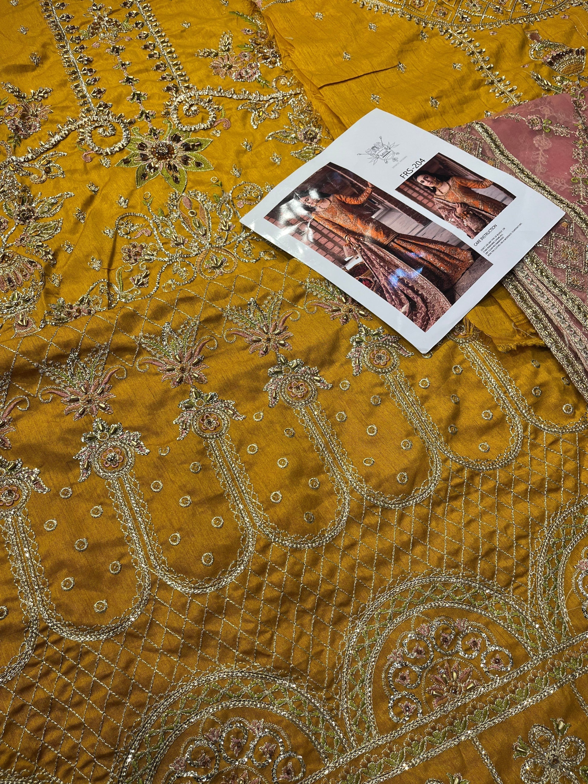 Gul-e-Maryam is our marigold yellow ensemble that will be an absolute treat to eyes and will lend you that perfect festive look. The peshwas is adorned with interacted metallic embroidery featuring floral motifs and sweeping archway patterns taking inspiration for Mughal architecture.The ensemble is paired with duo of dupattas one in shade of blush plink made of jacquard and graceful adorned with embellishments all over and encased in broad embroidered broader on all sides. The other dupatta balances the ensemble with simplicity offering diaphonous matching marigold dupatta with blue ends also adorned with light embroidery that will surely make you Look all pretty and glamorous