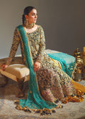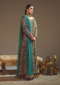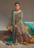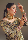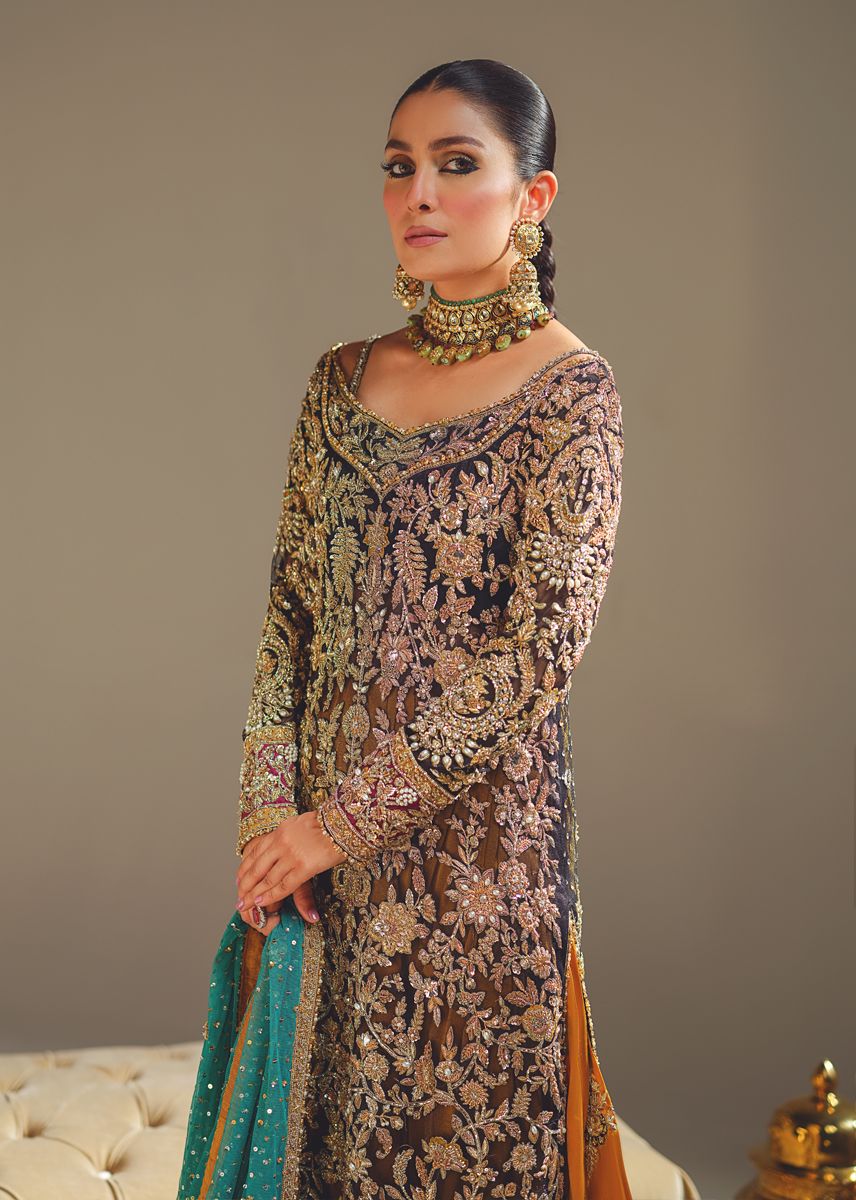 "KOHL SHADOW" is the perfect choice for those who appreciate the allure of dark and mysterious aesthetics combined with vibrant accents It's an outfit that embodies the beauty of traditional craftsmanship and a modern design sensibility. It will undoubtedly command attention and leave a lasting impression with its exquisite detail and regal color palette.Its black net shirt is a canvas of exquisite craftsmanship and traditional embellishment techniques that are created with a combination of zardosi, mukaish, and tilla work. The mustard flared sharara with motifs all over adds a sense of playfulness and elegance to the outfit and complements both the black shirt and the persian green dupatta, forming a cohesive and balanced look.