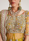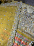 The crush sharara underneath is in the similar lime yellow color attached to a multi colored border with dainty embelishments and lined with printed silk. its net dupatta is heavily embellished on all 4 sided scalloped borders as well as spreaded with sequin bunches chatta all over.