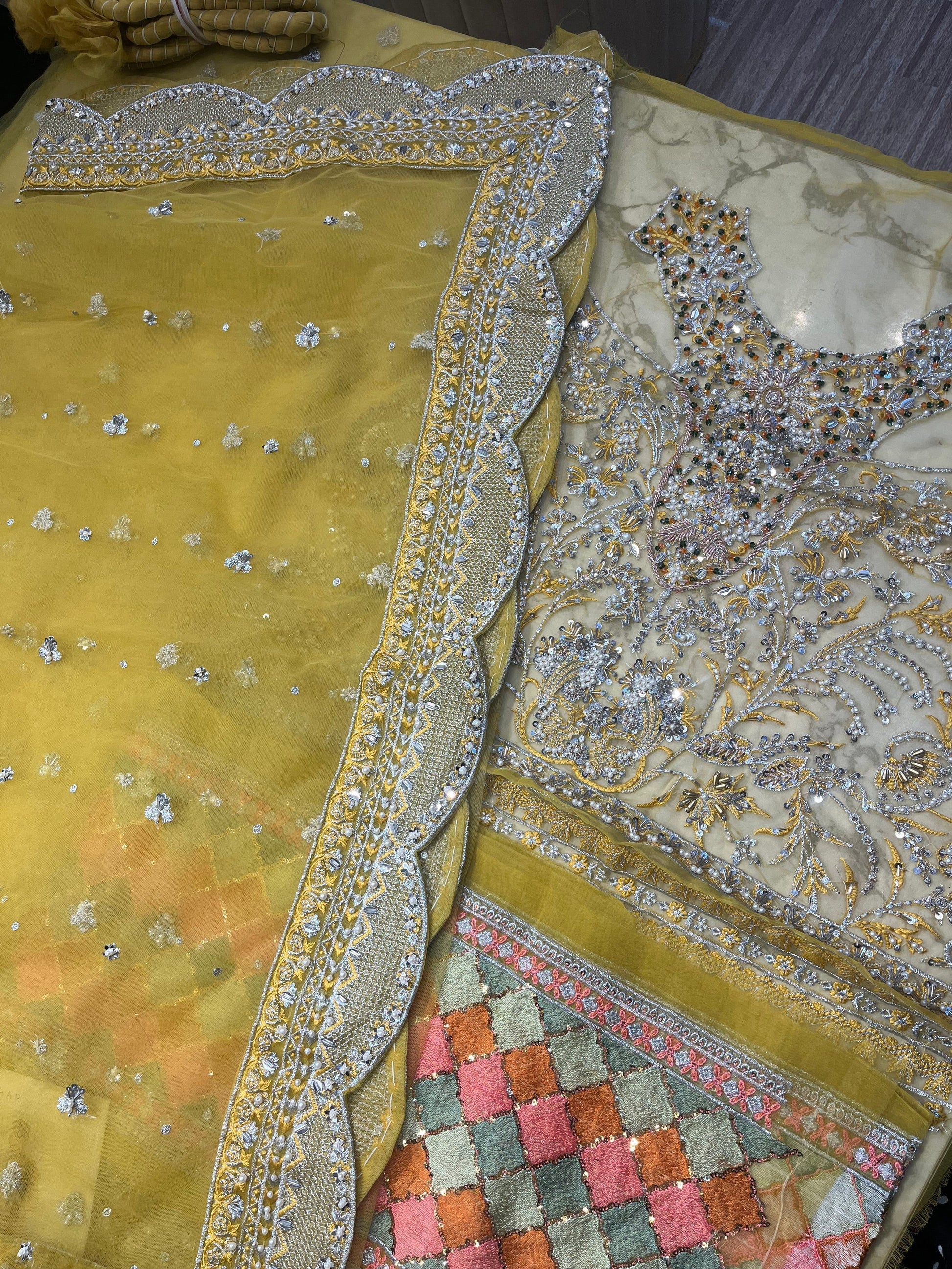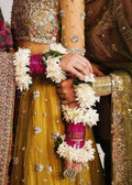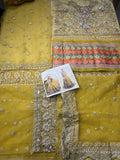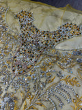 A spectacular lime yellow net peshawas with an embellished choker neck attached to intricately detailed front. The panels of peshwas are covered with beautiful chatta of small sequin bunches. The border of peshwas is made in a beautifully designed pattern which is also intricately detailed with adda work.