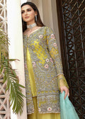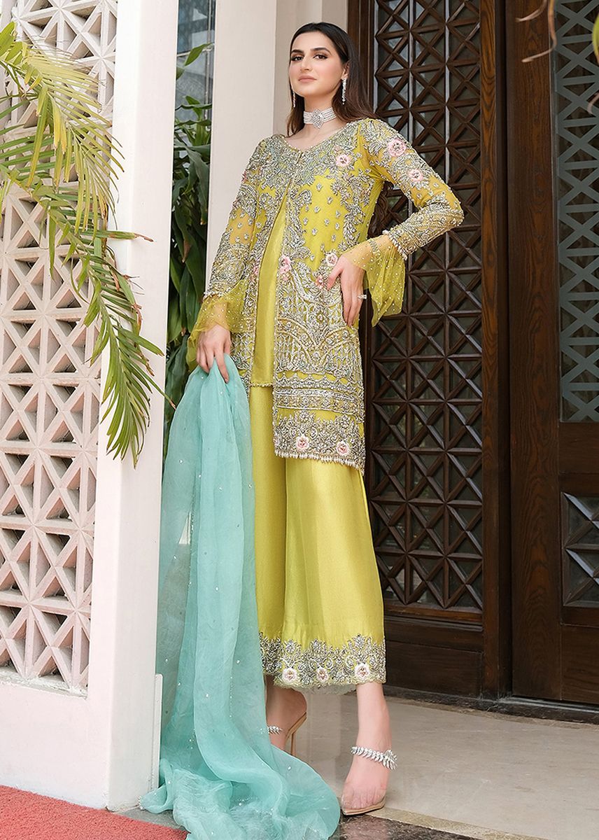 Lime yellow open shirt embellished with indicate sliver threadwork and floral embellishments.