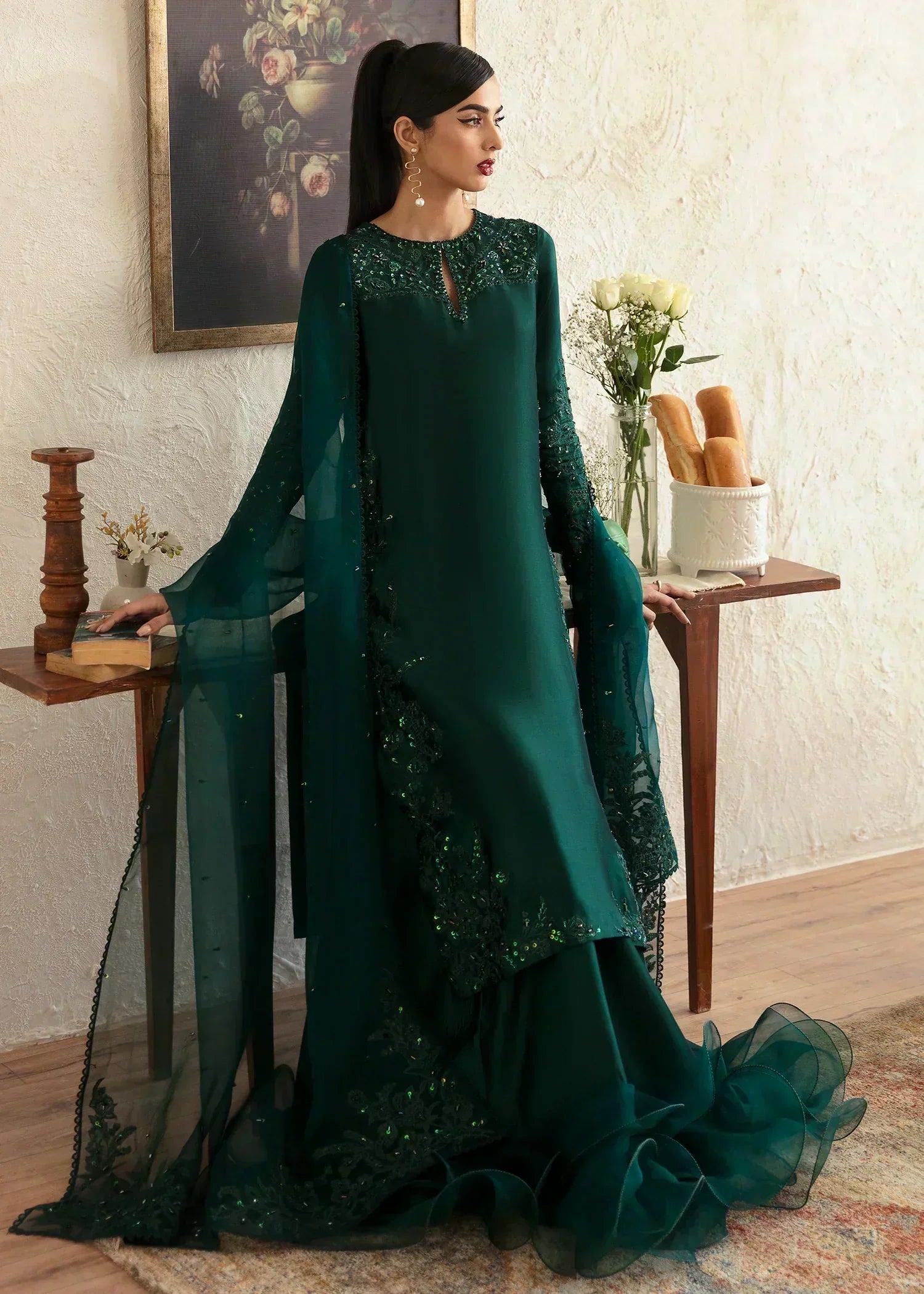 Nooré takes pride in its handcrafted party wear. Due to the delicate nature of our items, slight variations may occur (5-10%) in design, color, or embellishments. We recommend dry cleaning for all garments.
