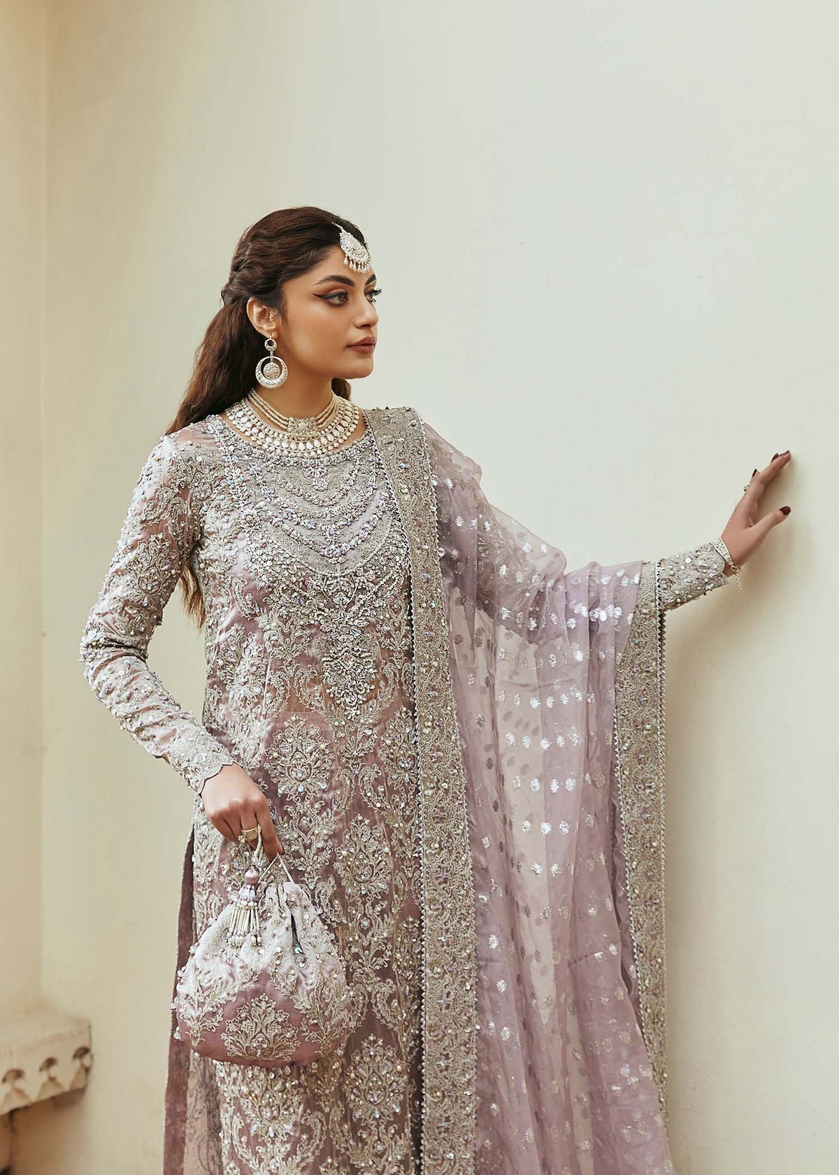 Dive into luxurious elegance with our lilac silver tissue beauty with delicate embroideries and intricate hand embellishments on this timeless silhouette. Paired with exquisite cullote pants and a badla dupatta with four sided borders framed with embellishments. This look is an epitome of ethereal and easy elegance.