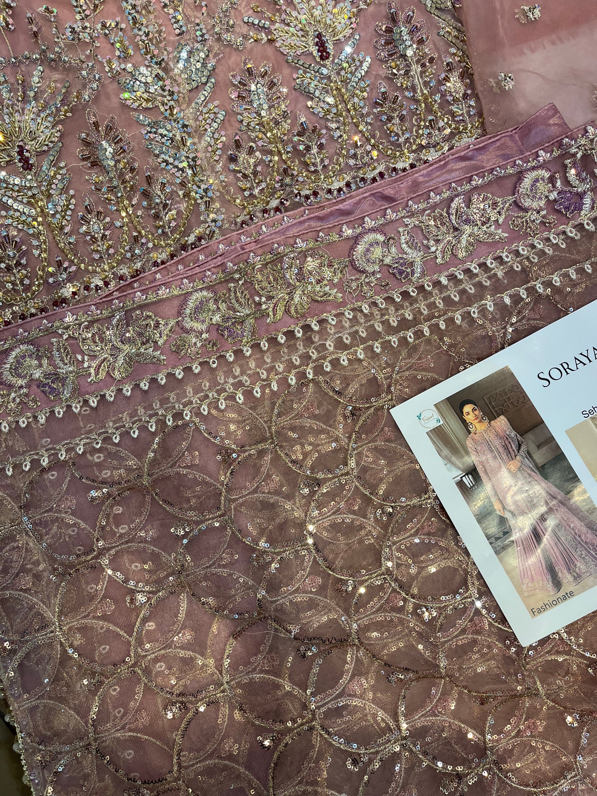 A perfect embodiment of celebration, ‘Sehr’ a graceful ensemble, featuring the timeless charm of dusty mauve. This lavishly adorned Organza Jacket and airy drape dupatta with enchanting screen print, is skillfully adorned with intricate hand embellishments work, pairied with a Crushed Sharara, adding a touch of traditional work.